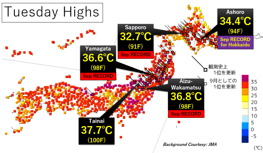 #Haishen has triggered the foehn effect over Northern Japan Tuesday. Lots of record highs were set. The mercury in Ashoro, Hokkaido, rose to 34.4℃, making it the record hottest September day for the the entire island! pic.twitter.com/aMrhtiS8qH