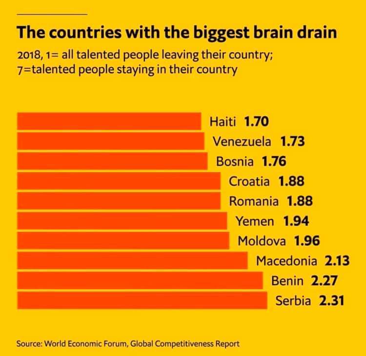 The countries with the biggest Brain Drain #Haiti#Venezuela#Bosnia#Crotia#Romania#Yemen#Moldova#Macedonia#Benin#Serbia#development#diaspora#Governancepic.twitter.com/nauvcuQ44f