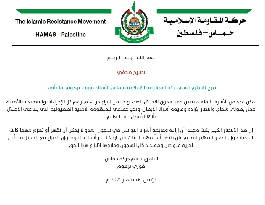 #Hamas has released a press statement hails the six six Palestinian prisoners' who escaped a high-security Israeli prison Monday morning.#نفق_الحرية#نفق_الحريهpic.twitter.com/wmlkL55g0F