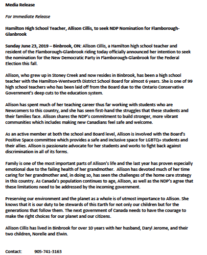 Today I am excited to announce my intention to seek the NDP candidacy for Flamborough-Glanbrook.