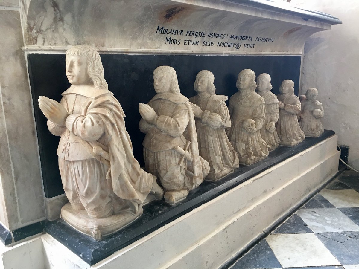 #Warnford,#Hampshire. This is the monument to Sir Thomas Neale (d.1621). His two wives accompany him in#alabaster, along with nine of his ten children, four of whom, carrying skulls, died in infancy.#mementomoripic.twitter.com/pB7ZeSRpuY