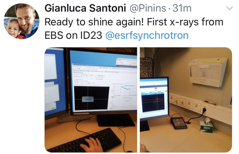 #HappyMood Les rayons X sont de retour à l’ESRF! Beaucoup d’excitation aujourd’hui sur les lignes de lumière de l’ESRF, avec l’arrivée du 1er faisceau de rayons X, avec la nouvelle source#EBS, et ce avec 1 mois d’avance.pic.twitter.com/K5QEcn6LGw