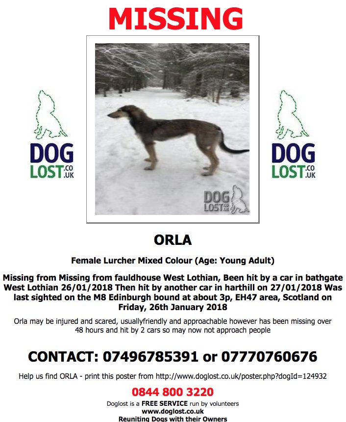 #LOST ORLA Female#Lurcher#Missing from#Fauldhouse#WestLothian hit by a car in#Bathgate 26/01/2018 Then hit by another car in#Harthill 27/01/2018 Was last sighted on the M8 Edinburgh bound at about EH47#Lostdog#ScanMe http://www.doglost.co.uk/dog-blog.php?dogId=124932#.Wm5An5OFhUc …pic.twitter.com/Ig9zdsbb2i