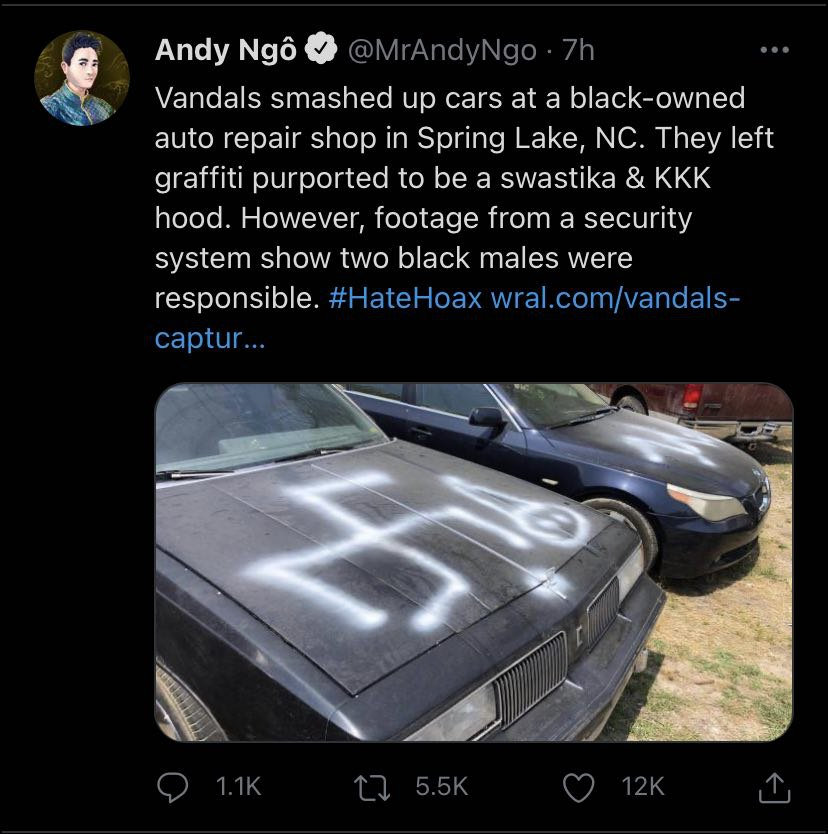 #HateHoax Southaven man who reported racist graffiti on vehicles charged with insurance fraud https://wreg.com/news/southaven-man-who-reported-racist-graffiti-on-vehicles-charged-with-insurance-fraud/ …Show this thread -