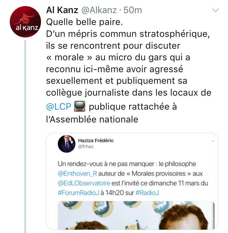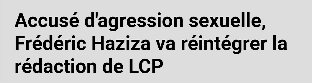 #France n'est plus le pays des droits de l'homme ( au sens de l'être humain ) C'est désormais le pays des droits du Mâle agresseur sexuel L'agresseur#haziza est réintégré à#LCP Sa victime la journaliste Astrid De Villaines@adevillaines est contrainte de démissionnerpic.twitter.com/wkxb70PG23
