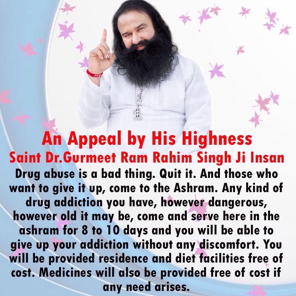 @Gurmeetramrahim ji says that drug abuse is a bad thing. Quit it &those who want to give it up come to@derasachasauda & serve here for 8 &10 days.#HealthyLife pic.twitter.com/DEgzFNkhiu