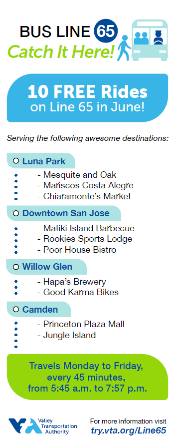. Line 65 is offering 10 FREE rides this month!!! Find more details here: https://try.vta.org/Line65 .