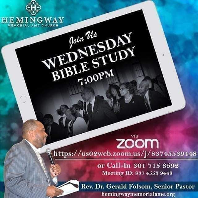 Join Hemingway for our Wednesday Evening Bible Study, 7-8 pm, via Zoom! I will be Teaching on Understanding the Kingdom Concept of Culture! Email connect@hemingwaymemorialame.org for Zoom Passcode!