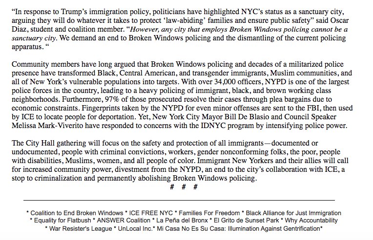 TOM 12:15PM, CITY HALL (Bway side): An immigrant-led coalition of groups denounce NYC's Broken Windows regime.