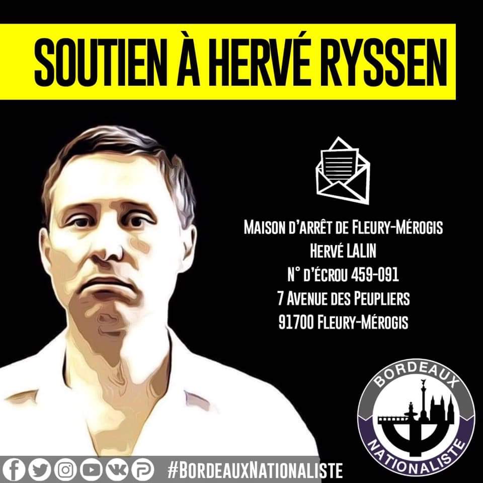 #HervéRyssen prisonnier politique ! Votre répression n'arrêtera pas nos convictions!#JeSuisRyssen#LiberezRyssen#FreeRyssen#Ryssen#Bordeaux#Nationaliste#BordeauxNationaliste#Nationalisme#Jeunesse#militantisme#répression#libertédexpression#france#Libertépic.twitter.com/CyciahQb2x