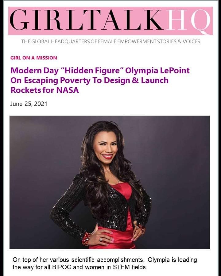 @GirlTalkHQ in their news segment. Check out the full article on: https://www.girltalkhq.com/modern-day-hidden-figure-olympia-lepoint-on-escaping-poverty-to-design-launch-rockets-for-nasa/ … Thanking@Icon_pr for this media placement.#OlympiaLePoint#GirlTalkHQ#AnswersUnleashed#STEMSpeakers#TVPersonality#HiddenFigures#NASA#STEMed#Diversitypic.twitter.com/OVUD5R2IXW