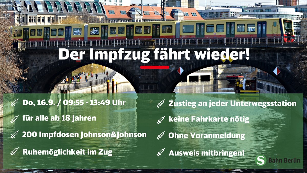 #HierWirdGeimpft verkehrt der Impf-Sonderzug am Donnerstag von 9.55 Uhr bis 13.49 Uhr auf der Stadtbahn. https://sbahn.berlin/das-unternehmen/presse/pressemitteilungen-pressearchiv/pressemitteilungen/corona-impfzug-tourt-ueber-die-stadtbahn-mit-verdoppelter-kapazitaet/ …pic.twitter.com/xcRqPjCkhk