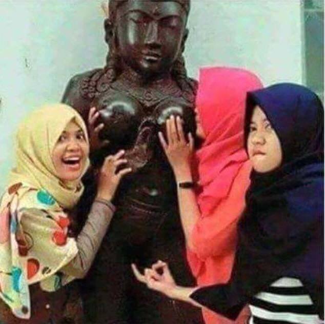 this image has symbols/reps from 2 faiths. 1 is being victimized (hinduism) and the other showing abrahamic supremacy on infidels or indigenous faiths to the region. Example of