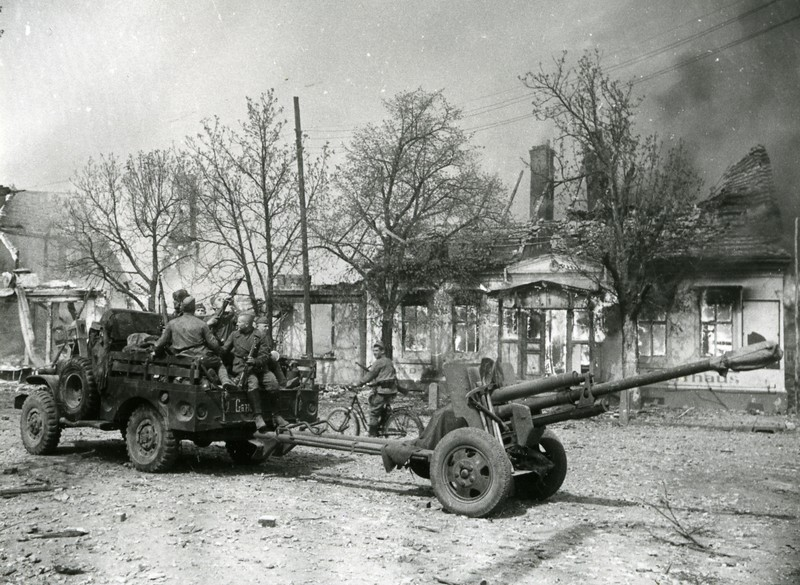 Lend Lease Dodge truck towing a 76 mm ZIS-3 field gun, vicinity of Berlin, April 1945.