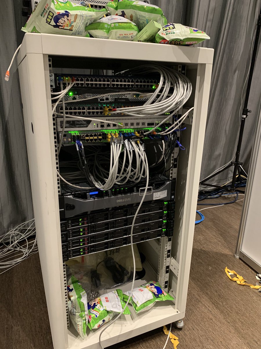 Those pictures are HITCON CTF competition environment. Using 4 rented server to host all virtual machines. Actually, in first picture, all machine are putting on the folding hand cart during the hold competition.