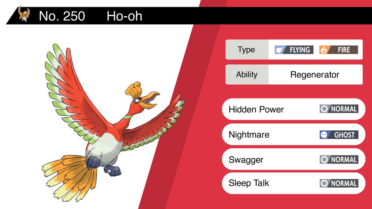 Ho-oh Ability: Regenerator Moves: Hidden Power, Nightmare, Swagger, Sleep Talk