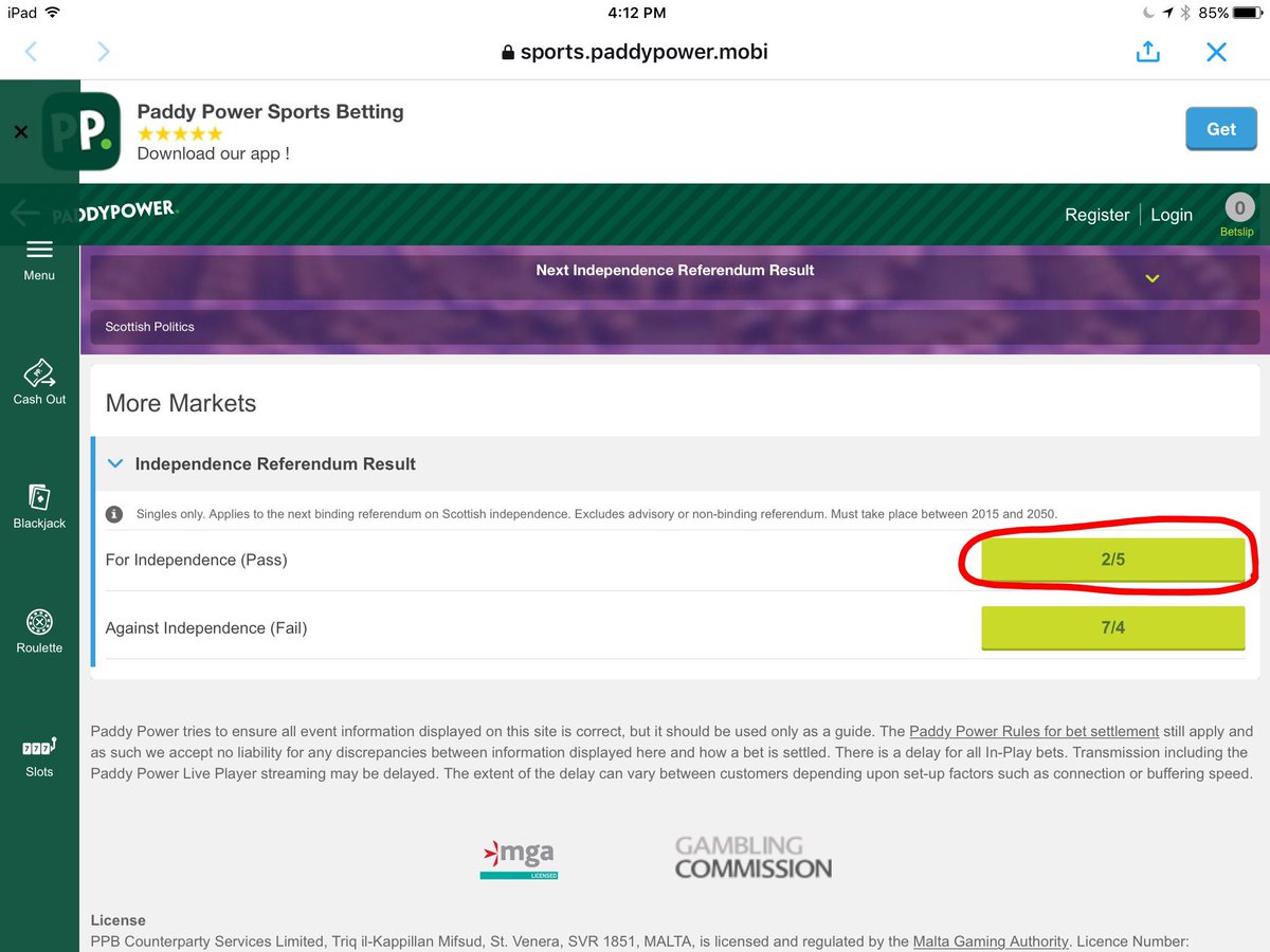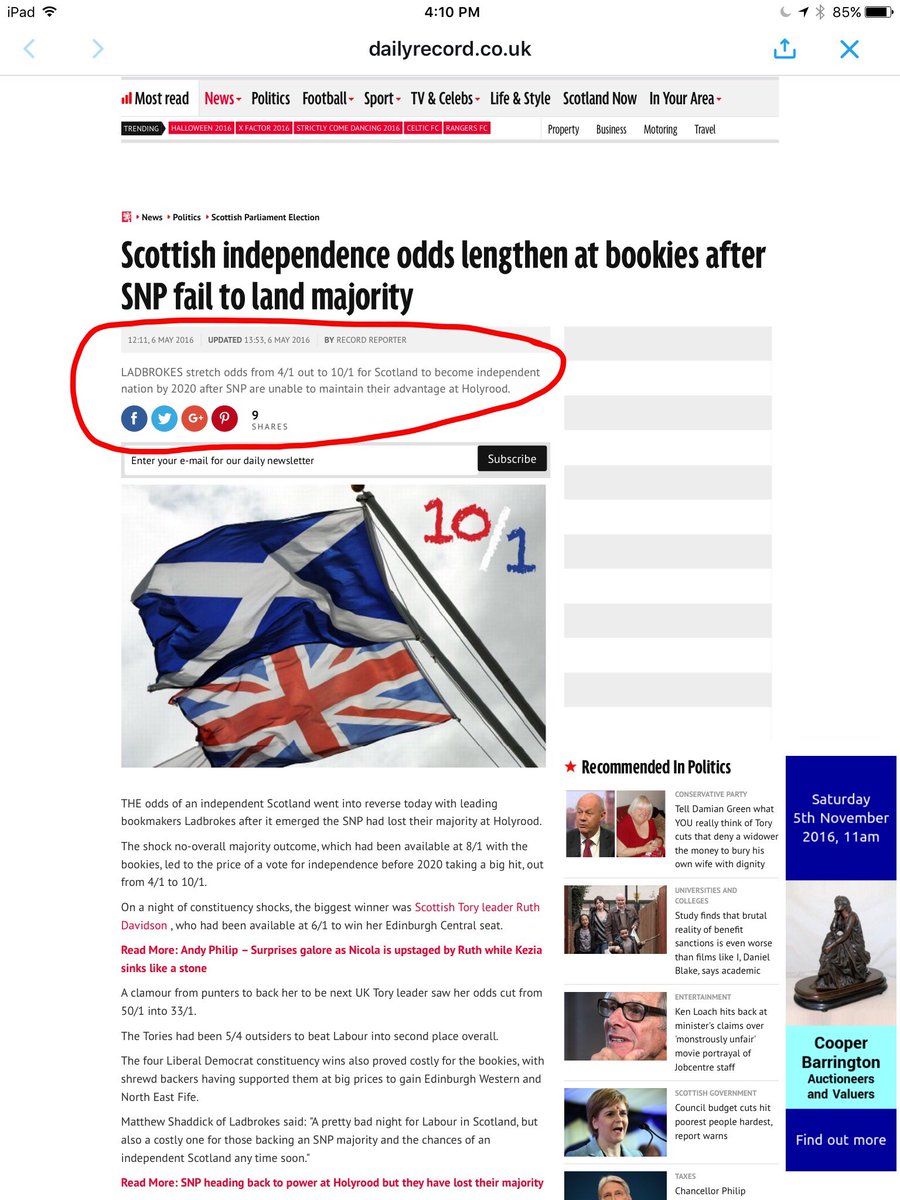 #Holyrood2016! Then#Brexit +#TheNationalSurvey =@paddypower 2/5 Independence! YES is 71.43% probability!!!pic.twitter.com/nBla1f2GOf