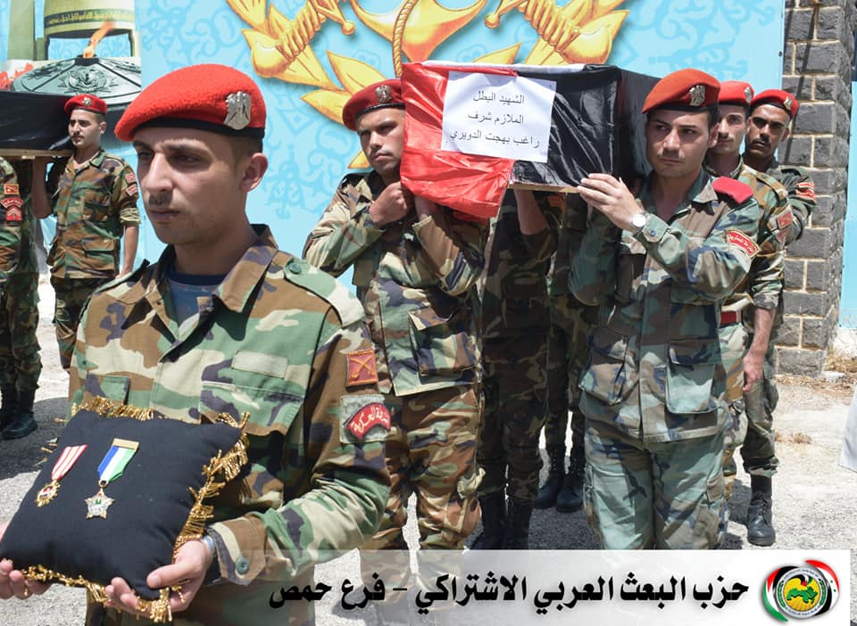 #Syria: bodies of soldiers & Colonel (pic 1) slain in#Israel|i airstrikes last night leaving#Homs Military Hospital for burial. 8 dead documented so far. Work continues to find additional missing fighters in ammo depot blast in Hashma. pic.twitter.com/Icydt1xVM9
