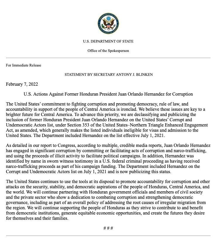 Ya es oficial: Estados Unidos ha revocado la visa del expresidente Juan Orlando Hernandez. Su inclusion en la Lista Engel se hizo efectivo el 1 de julio 2021, pero hasta hoy se hace publico.