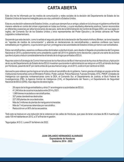 Juan Orlando Hernandez writes a public letter in response to US Secretary of State after it was revealed that JOH’s visa would be revoked & he is named on the United States’ Corrupt and Undemocratic Actors list