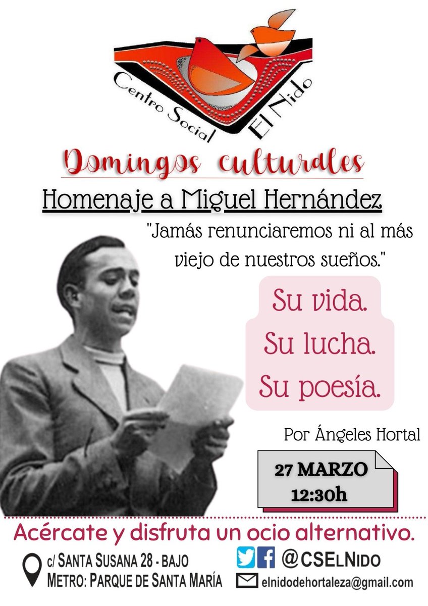 #Hortaleza, homenajeamos a Miguel Hernández, poeta del pueblo. Después, comida casera: risotto de calabaza. ¡Os esperamos! pic.twitter.com/B4MJInLsp3
