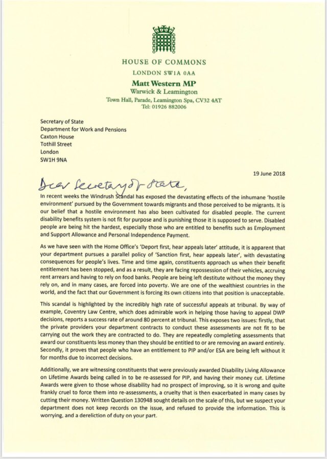 #HostileEnvironment approach. I was therefore very pleased to support@MattWestern_ 's letter to the Secretary of State calling for urgent reform of the Disability Benefit system.pic.twitter.com/I2pP1mAndn