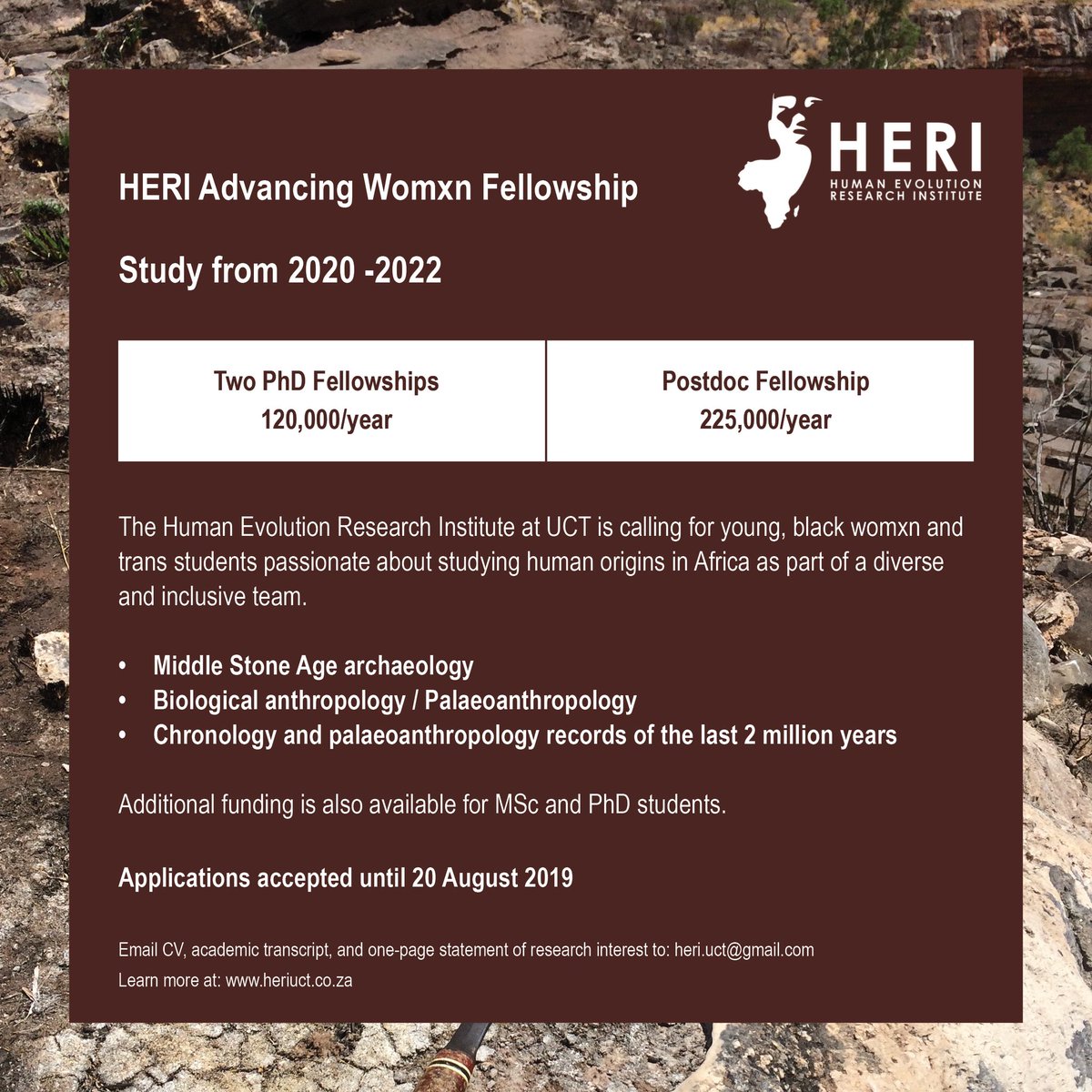 #humanorigins? 2 PhD fellowships (R120,000 p/a) & a postdoc fellowship (R225,000 p/a) are available for black women or trans students at the#HumanEvolution Research Institute (@heri_uct). Apply by 20 Aug 2019. More info: http://bit.ly/HERIfellow2020 pic.twitter.com/dcCn82TGFJ