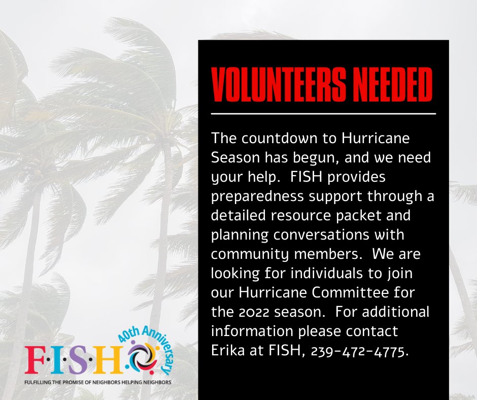Each year, we create a hurricane preparedness resource packet available to all islanders. Many volunteers assist with this program, and we need more help! Contact Erika at FISH, 239-472-4775 for additional information. .