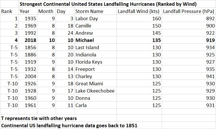 #hurricanes on record as ranked by maximum sustained wind.#Michael ranks 4th with sustained winds of 135 knots (155 mph) at landfall.pic.twitter.com/eqfY0ocG4x