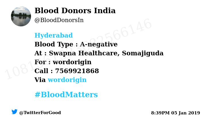 @wordorigin#Hyderabad Blood Type : A-negative At : Swapna Healthcare, Somajiguda Primary Number : 7569921868#BloodMatters Powered by Twitterpic.twitter.com/E6KxuwDIWX
