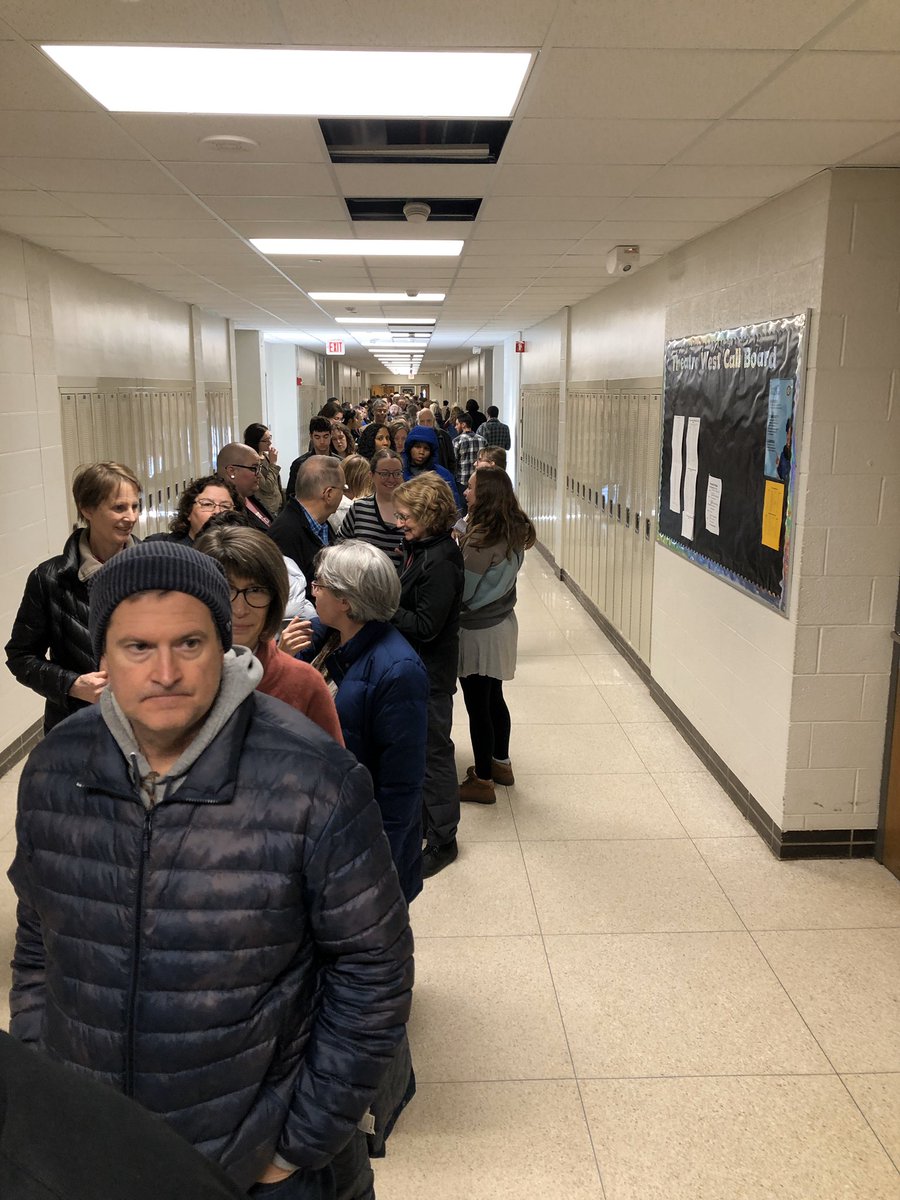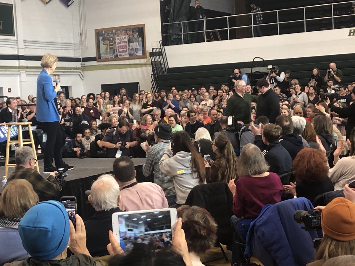Probably 1,000 people in line to see Warren at West (Iowa City) high school. She’s tearing across the state today after arriving from DC last night.