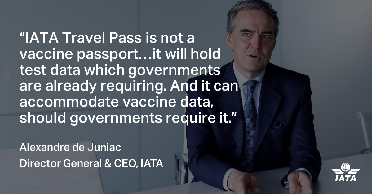 IATA travel pass set for release in early part of 1Q2021 The travel pass is a secure integrated digital solution for contactless travel Key elements: Data privacy, verified identity, verified testing and vaccination and bio safety