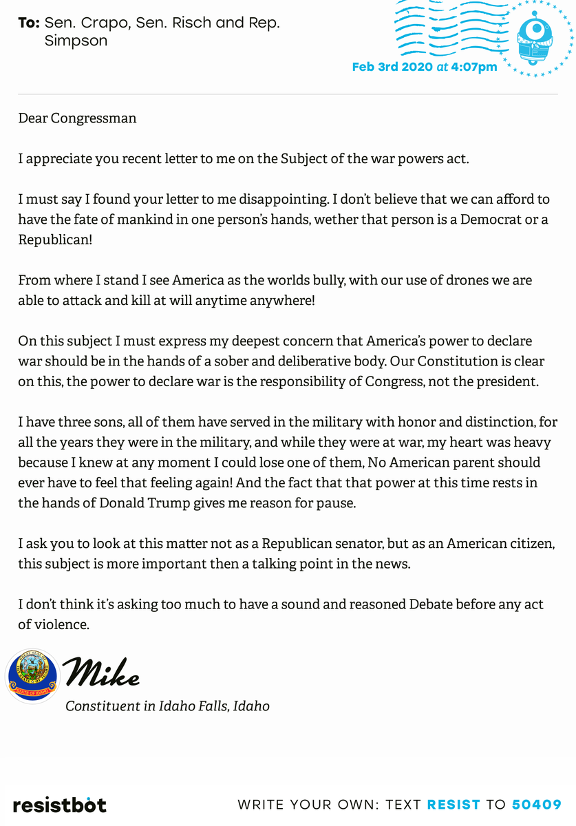 I just delivered this letter from Mike in Idaho Falls, Idaho to @MikeCrapo,@SenatorRisch and@CongMikeSimpson#ID02#IDpol