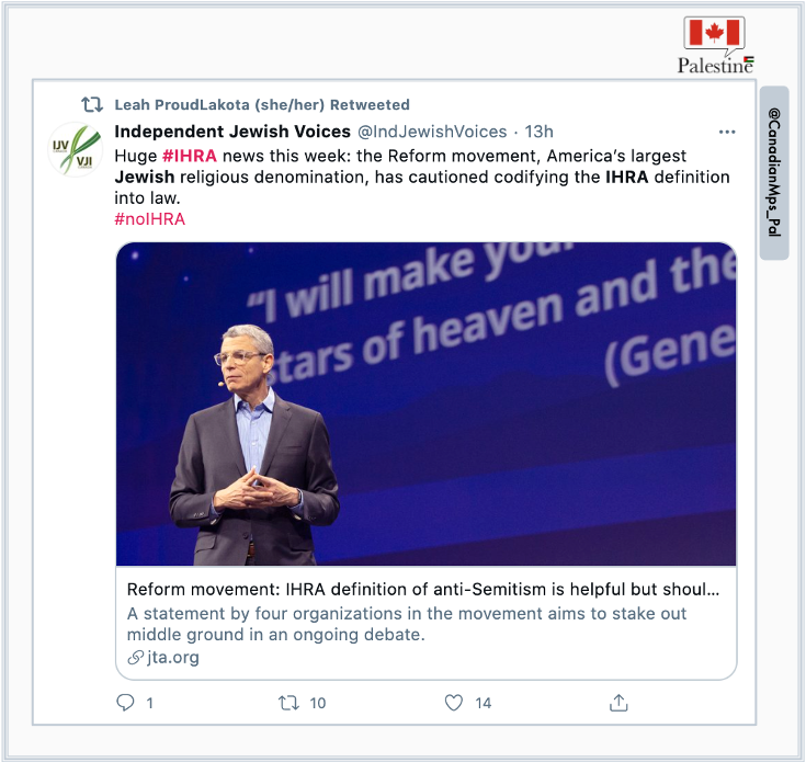 @LeahGazan retweets an article that opposes the codification of the increasingly controversial#IHRA definition of antisemitism in law.#noIHRA@IndJewishVoicespic.twitter.com/pk33zudipn