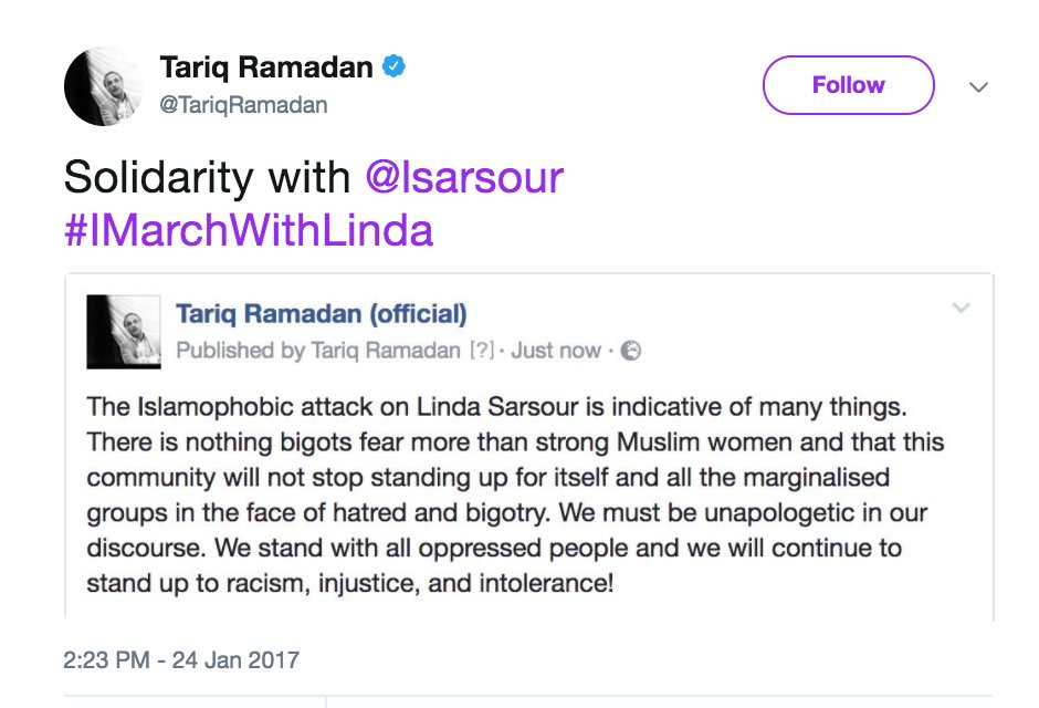 @lsarsour Now that he's being held by French police—accused of serially raping Muslim women followers, as well as numerous high school students—will you disavow Tariq Ramadan's#IMarchWithLinda support? pic.twitter.com/27LHicdUKL