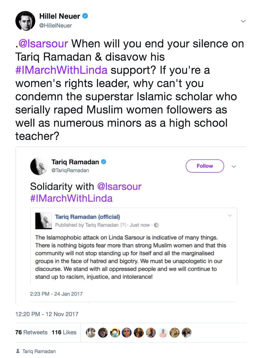 @lsarsour When will you end your silence on Tariq Ramadan & disavow his#IMarchWithLinda support? If you're a women's rights leader, why can't you condemn the superstar Islamic scholar who serially raped Muslim women followers as well as numerous minors as a high school teacher? pic.twitter.com/PpH4RTqgGm