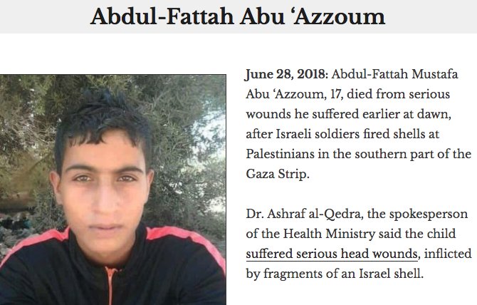 Palestinian 17-yo) was killd by #IOF ... He was rushed to Abu Yousef Najjar Hospital, in Rafah, where he underwent an urgent surgery, but later succumbed to his wounds at the Intensive Care Unit… https://israelpalestinetimeline.org/abdul-fattah-abu-azzoum/ … May his soul rest in peace.pic.twitter.com/had2eJanqn