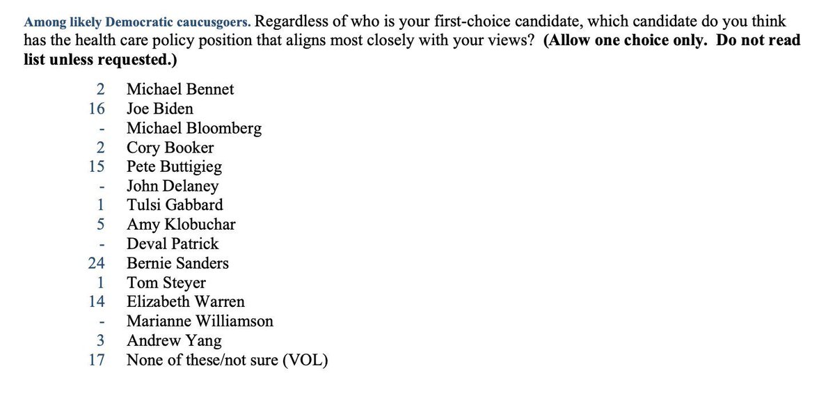 “Which candidate do you think has the health care policy position that aligns most closely with your views?” Sanders: 24% Biden: 16% Buttigieg: 15% Warren: 14% Klobuchar: 5% Yang: 3% Booker: 2%