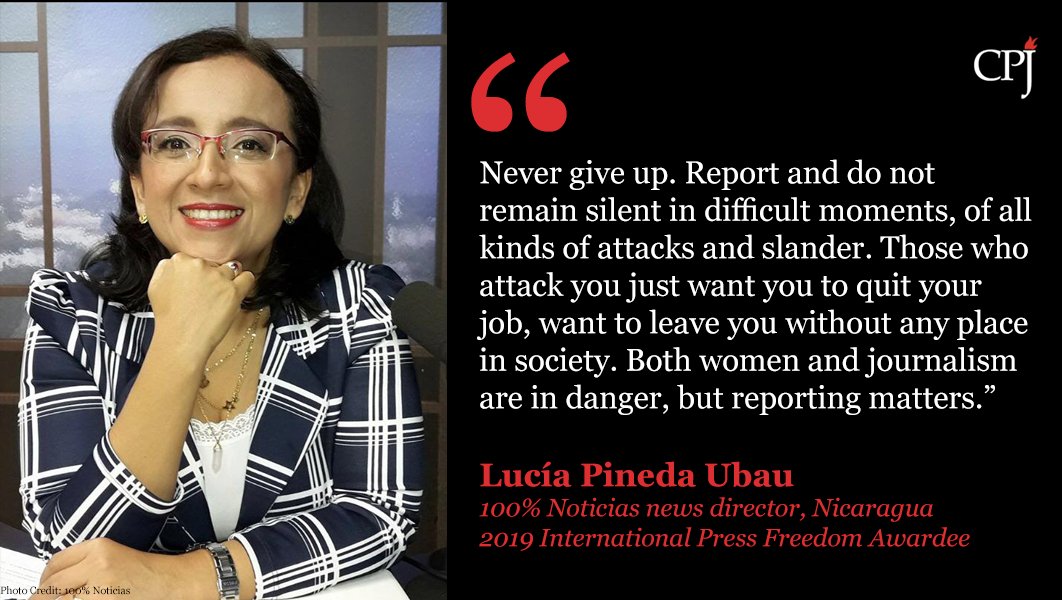 #InternationalWomensDay This is journalist Lucía Pineda, who was imprisoned in#Nicaragua in retaliation for her journalism. She is a recipient of the 2019 International Press Freedom Award.#IPFA. We proudly share this piece of advice from Lucía for all women journalists. pic.twitter.com/J7UkstS6VW