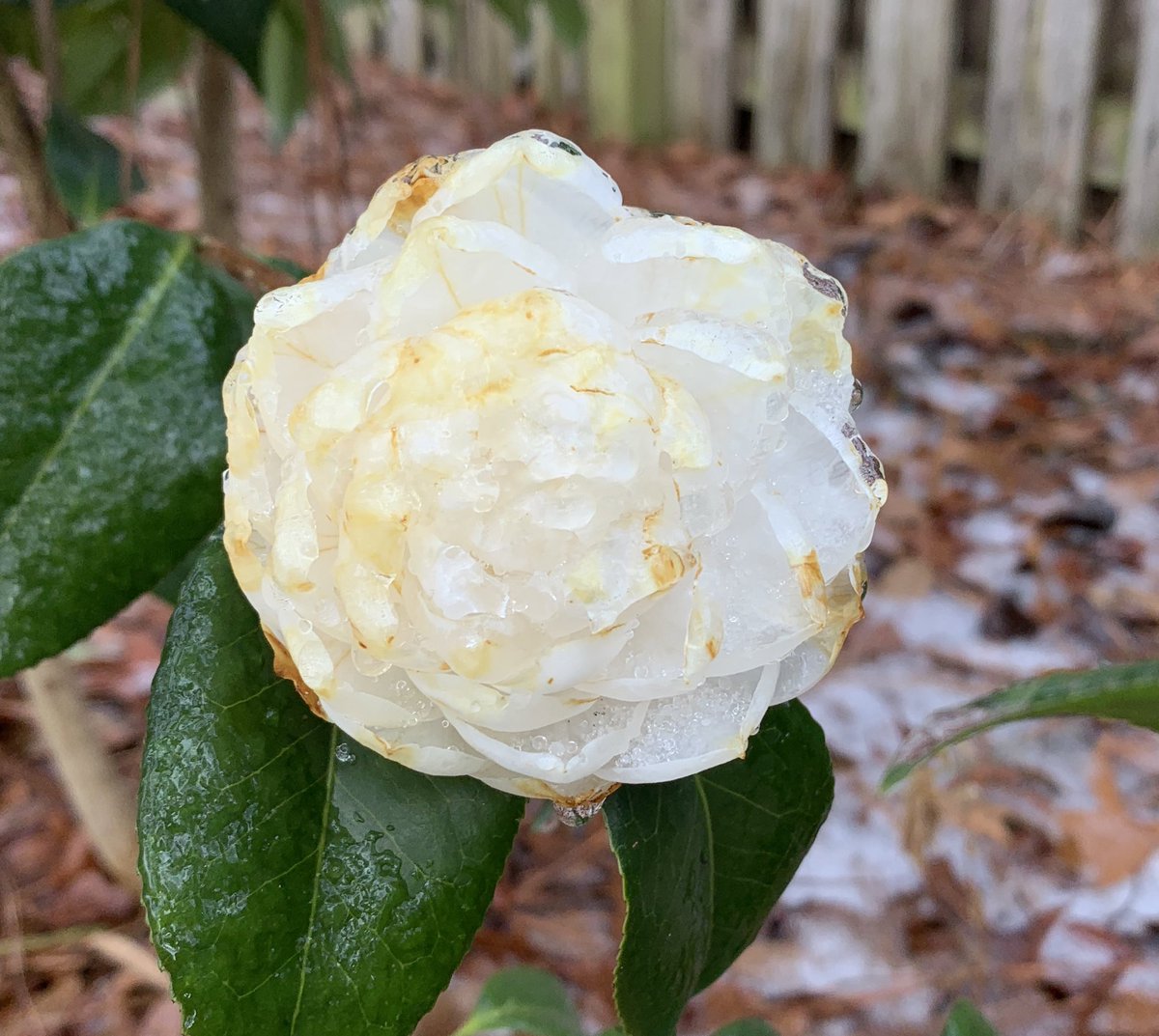 Seafoam camellia, a formal double bloom, encased in ice.