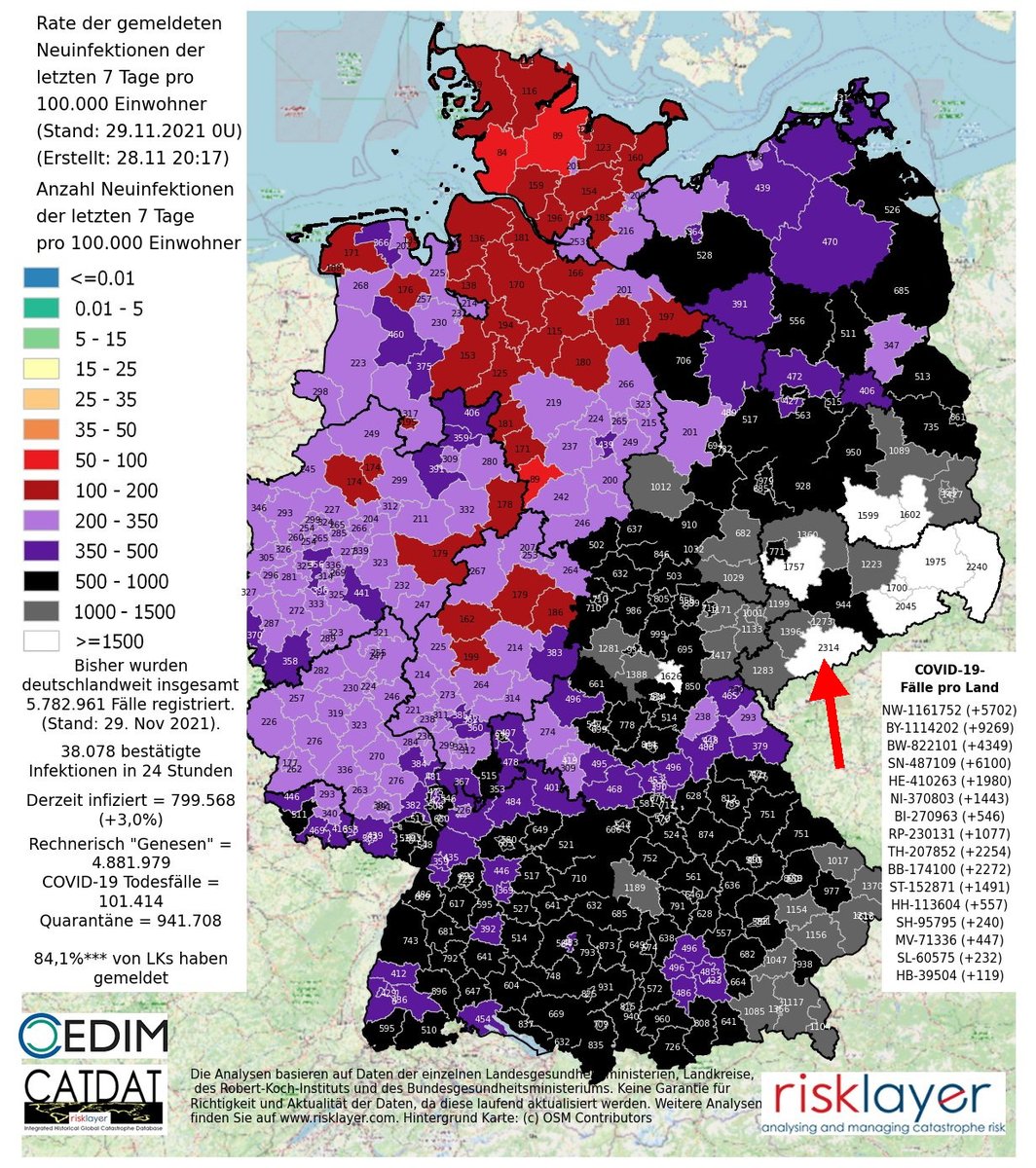 So the highest number on today's map is 2314 infections per 100.000 The Germans earlier implemented thresholds of 35 and 50 and 100 when new restrictive measures cam into force following their