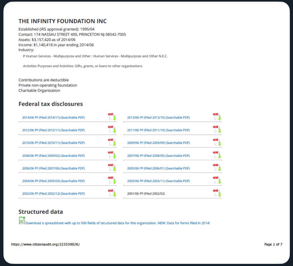 @RajivMessage@SwarajyaMag@HartoshSinghBal@thecaravanindia@FriedrichPieter || Gee, been a while since anyone’s checked the public access filings of the#InfinityFoundation to make sure Rajiv’s fully transparent about his *tax-exempt* $$$. Go here => http://citizenaudit.org .pic.twitter.com/aDRRoQx0Vr