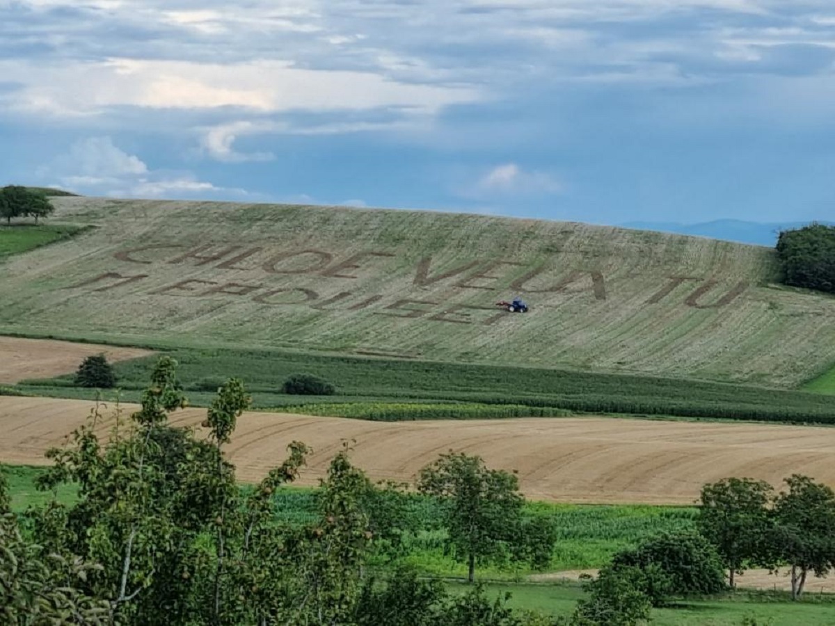 #insolite. Dans le Bas-Rhin : un message géant "Chloé veux-tu m'épouser ?" tracé au tracteur dans un champ de Ringendorf... (Cc@chloe_steinmetz)#mariage#agriculture