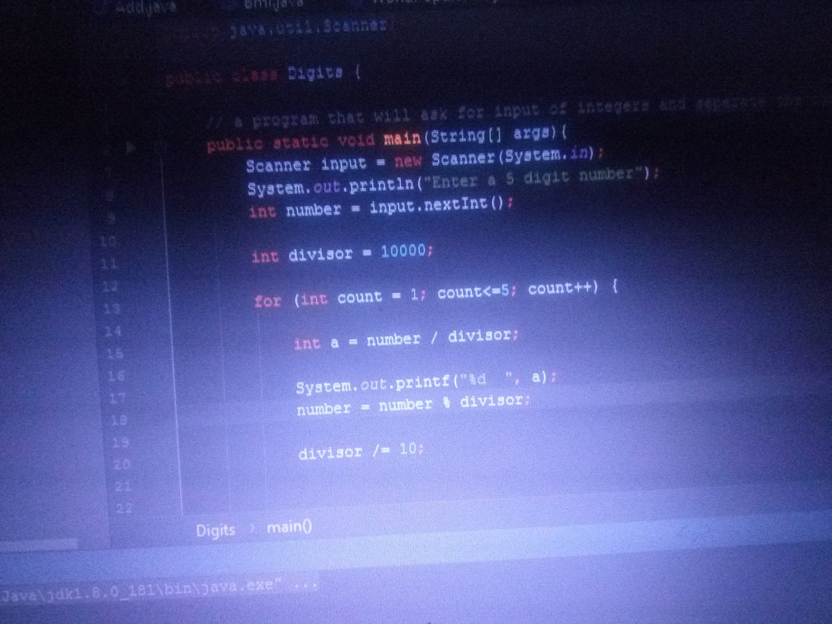 #100DAYSOFCODE#InternHub2019 Day6 : it was a very wonderful day as I was able to practice all that I have learnt so far@Intern Hub2019 by using for loop and class Scanner to run a program that separate a Number input from the keyboard. Thanks to@Oparaben and@AmPaschal01pic.twitter.com/ST5JvrfrU2