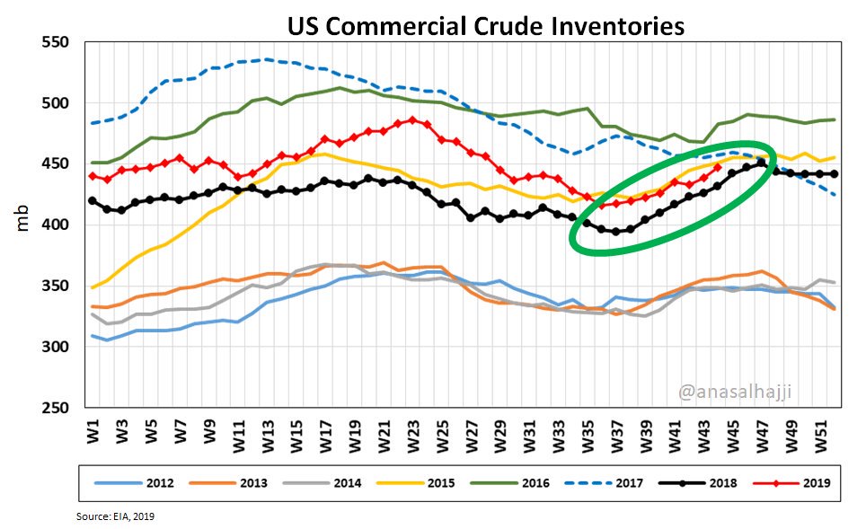 #inventories are following the historical trend for this period. The problem is: it is following the 2018 trend, without increase in Saudi oil production & without exemptions from#Iran sanctions! EIA: Crude: +7.931 mb Gasoline: -2.828 mb Distillates: -0.622 mbpic.twitter.com/xw1KmA0xsw