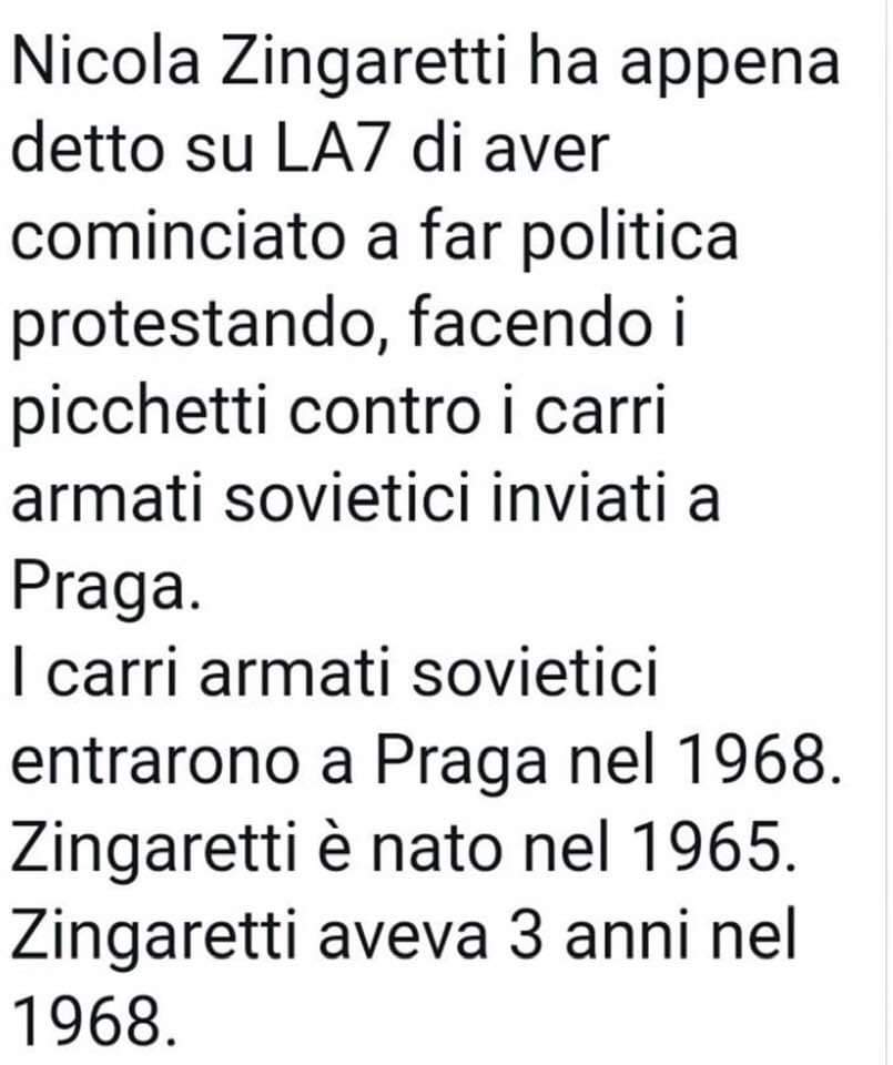 #Zingaretti dice di aver iniziato a fare politica facendo picchetti contro i carri armati sovietici a Praga. I carri armati entrarono a Praga nel 1968.#Zingaretti è nato nel 1965. Aveva 3 anni...#silenzioelettorale#ElezioniEuropee#StavoltaVoto