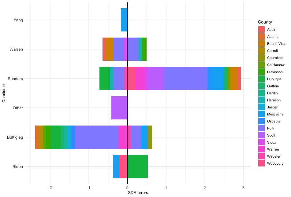 #DemDebate#IowaCaucuses The media story out of Iowa is that caucuses are a mess. Thankfully, the media won't report that the errors overwhelmingly benefited Pete and screwed Bernie. Visualization below. pic.twitter.com/heih6QQaAa