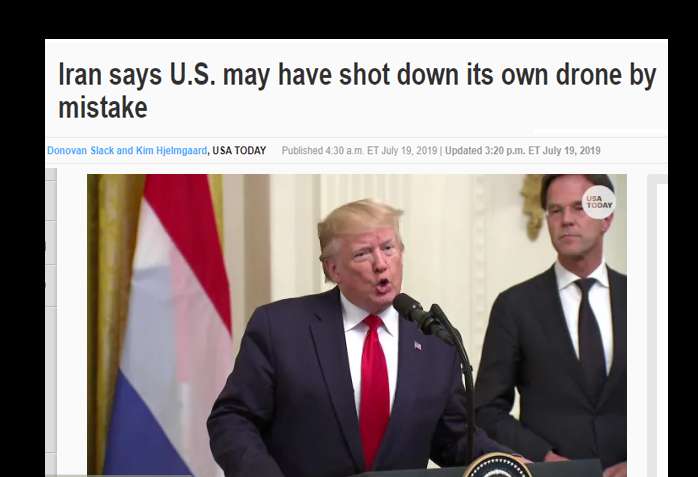 corrects #Trump's false statement that the#IranianDrone was immediately destroyed after receiving multiple calls to stand down. U.S. defense officials claim it was disabled not by bullets or missiles but by jamming. https://www.c4isrnet.com/unmanned/2019/07/18/marine-jamming-jeep-sends-unknown-drone-to-the-deep/ … -