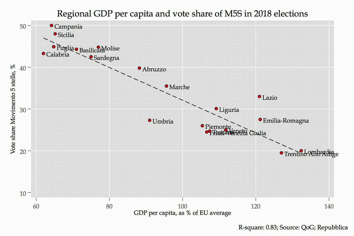 Interesting graphic: Regional GDP per capita and vote share of 5 Star Movement in