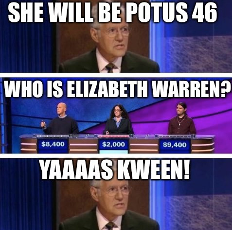 #POTUS46 Q: Who is Elizabeth Warren?@ewarren Reax: Yaaaas Kween! And welcome back to@Jeopardy Sept 9 Alex Trebek#JEffect [#Jeopardy meme@mattheartspade]#PresidentWarren#TeamWarren#Warren2020#WinWithWarren